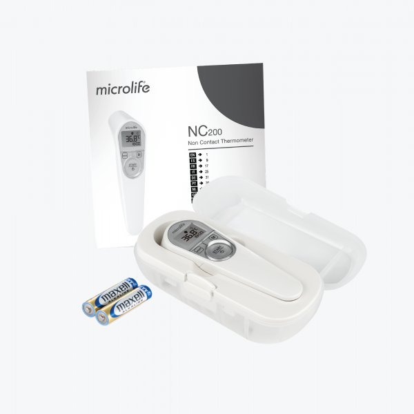 Nhiệt kế đo không chạm Đo hoàn toàn tự động (đế nhiệt kế cách vật thể 5cm sẽ tự động đo) Đo trong vòng 3s Đo được thân nhiệt, môi trường Mẫu mã sang trọng, nhẹ nhàng và thân thiện Chuyển đổi giữa °C – °F Tầm đo thân nhiệt từ 34 °C – 43 °C (± 0.2°C trong khoản 35°C – 42°C ) Tầm đo môi trường 0<100°C (±1.0°C) Màn hình LCD 4 chữ số với ký hiệu riêng Bộ nhớ 30 lần gần nhất Tự động tắt nguồn trong 1 phút Loại pin: 2 pin 1.5(V) loại AAA Có đèn báo sốt khi thân nhiệt hơn 37,4°C Nhiệt kế hồng ngoại NC 200 nhỏ gọn, dễ sử dụng, phù hợp cho việc đo thân nhiệt cho người lớn và trẻ em. Đo nhanh, không chạm, an toàn, chính xác, thích hợp sử dụng tại bệnh viện, phòng khám, cơ quan, trường học, gia đình…